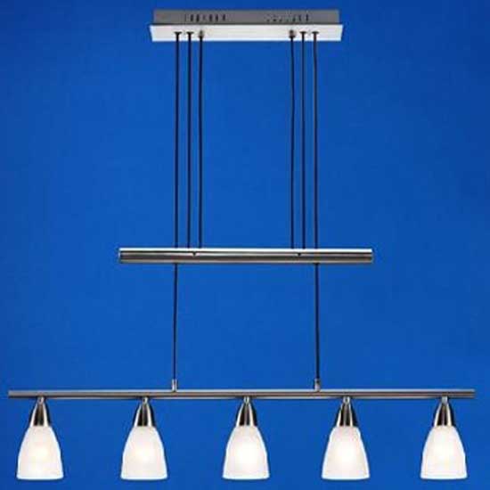 This modern chandelier hangs down a row of 5 bell-shaped lampshades for maximum illumination. The lamp is nicely crafted for an impressively long life of 8,000 hours. The height is adjustable by pulling the thread. This stunning chandelier is a stylish addition of shop lighting.