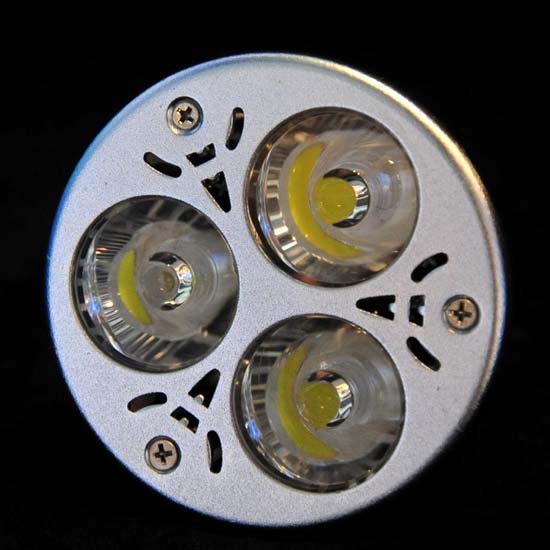 Displayed here is a spotlight with a sturdy housing for excellent heat dissipation. It is fitted with three 1W bulbs for clear illumination. Light up your area with this energy-saving spotlight.