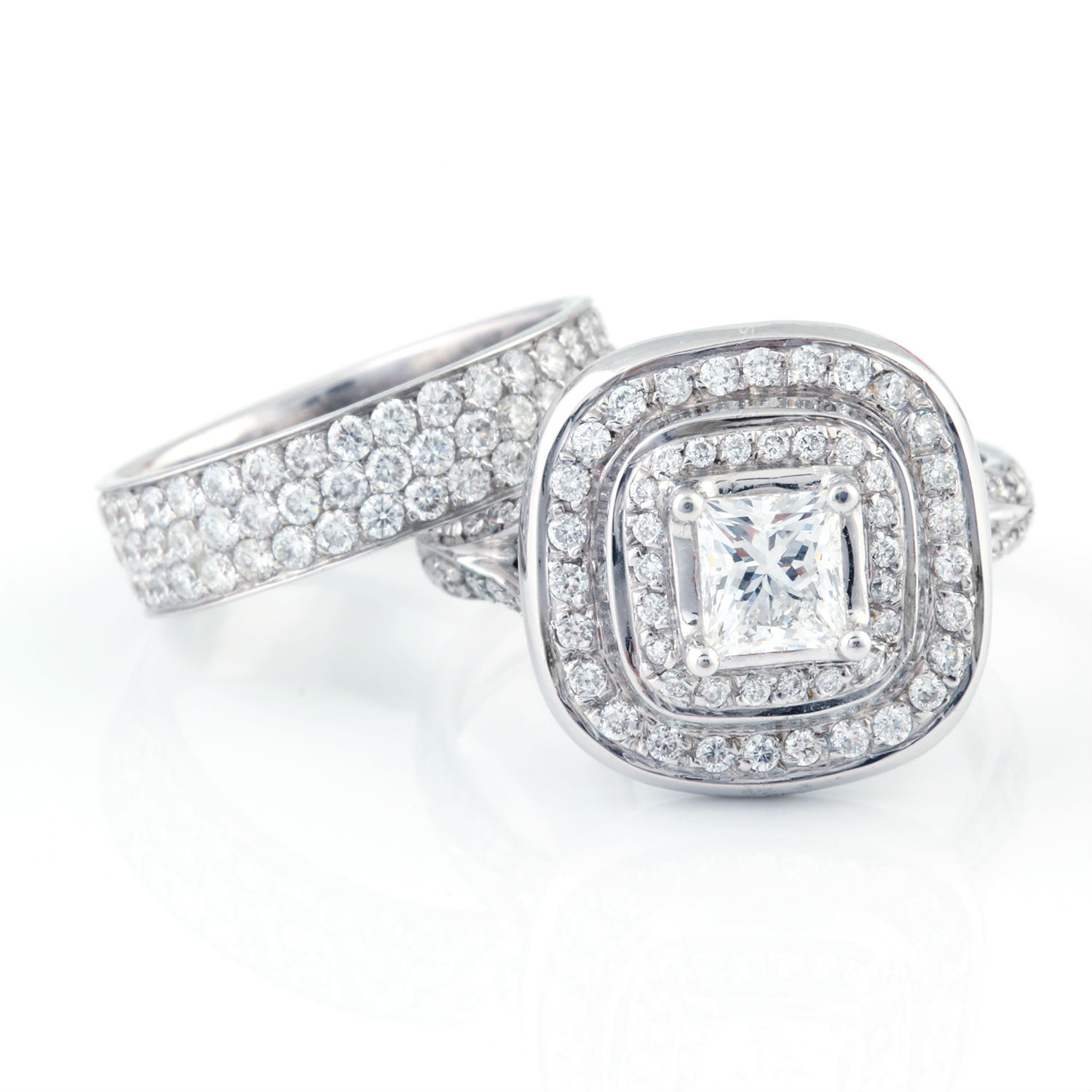 This ring 14K white gold set is comprised of 2.16Ct round white diamond and 0.93Ct center stone princess white diamonds.