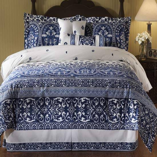 This is a comforter set with decorative pattern in white and blue. 2 sizes of Queen comforter set and King comforter set are provided to suit each customer's need. This design also offers Queen duvet set and King duvet set which give a warm and comfortable rest for the customers.