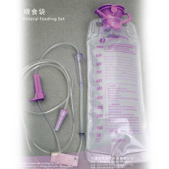 The enteral feeding set includes a bag and a pump that are especially designed to provide the nutrition for patients. The rigid neck of the pump allows easy filling and handing. The bag is available in different capacities of 500ml, 1,000ml, 1,200ml, 1,500ml, etc.