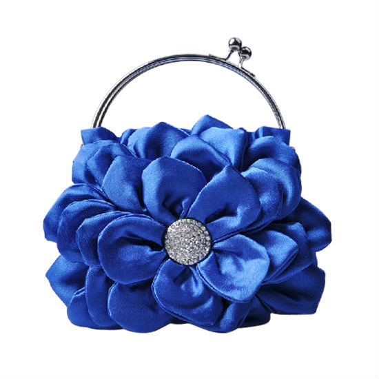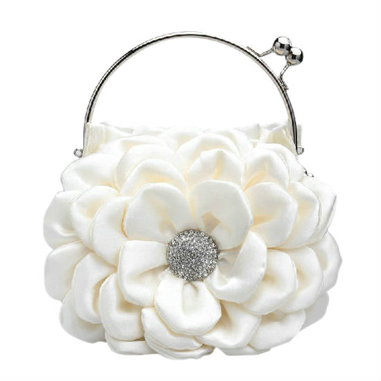 Layers and layers of silky fabric petals transform this precious evening bag into a blooming blossom that stays in its prime forever, highlighted by a glistening center paved with stones. The double handle completes the feminine accessory with a whimsical kiss lock closure.