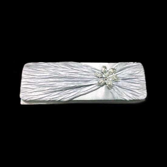 This is an elegant evening bag that comes in a rectangular shape and boasts a charming silvery look. The stunning design is sure to catch attention at parties. Adorned with a metal floral ornament, this stylish evening bag is an ideal addition to complete your wardrobe.
