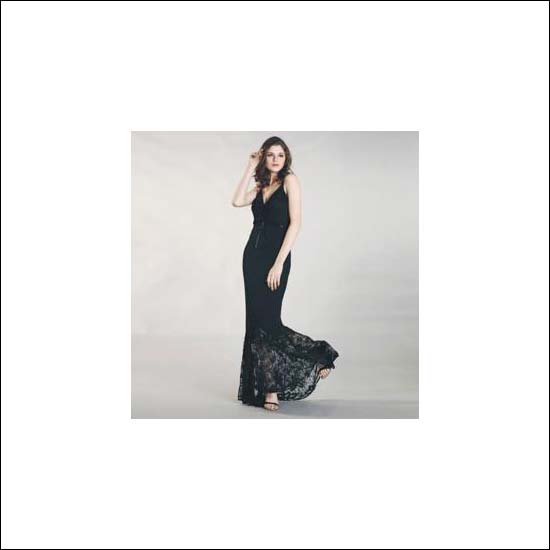 This black evening dress is a long and full-length dress with a deep V-neckline