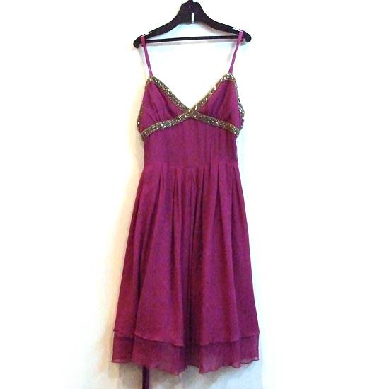 There are exquisite beads around the V-neckline of the dress as decorations.