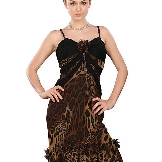 This cocktail dress is designed with animal prints. It has a sweet-heart neckline as well as rolled straps. There are also also feather with matching colors at the bottom of the dress as decoration. This dress is ideal for various social occasions.