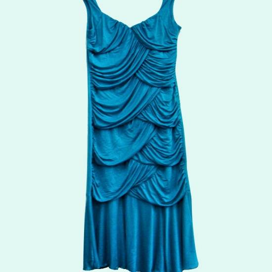 This sleeveless evening dress features multi-layered drapes that extend from the neckline to mid-thigh. The drapes create an illusion of length and camouflage your figure flaws. It falls above knee to give a flattering length. This stunning dress will definitely draw admiring glances.