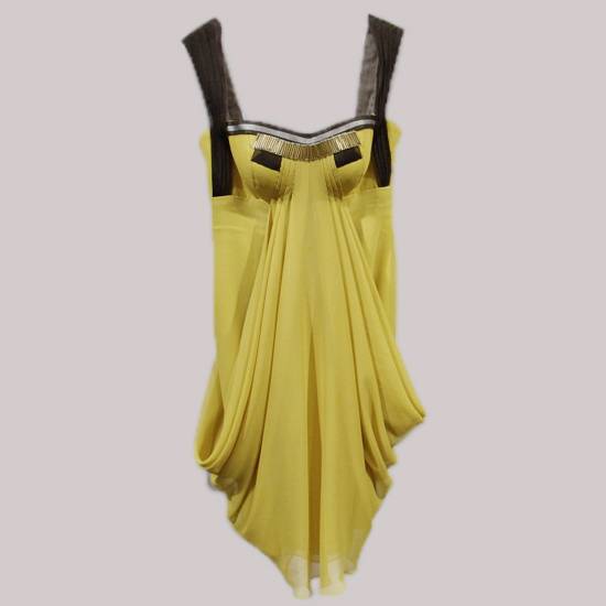 Featured is a silk evening dress in bright mustard and black. This sleeveless dress comes with ruffles on the front to give it an elegant and graceful look. The cutting makes ladies look slim and fit. It is a perfect outfit for cocktail parties and evening balls.