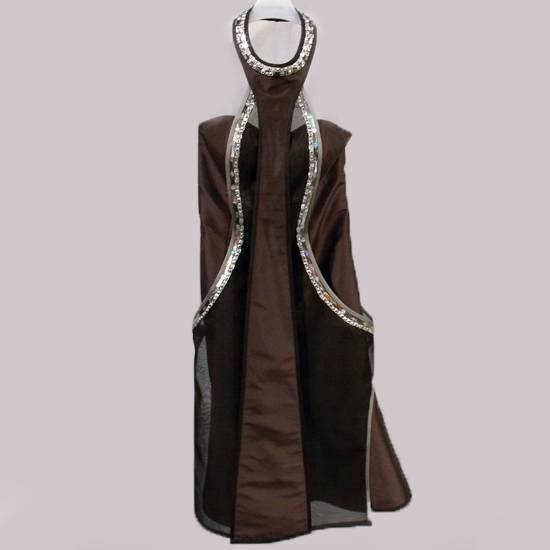 Featured is an evening dress falls at the knee. The layers at the bottom and the neckline are elegant in design. It is decorated with silver beads along the edges. It is a great outfit for cocktail parties and evening balls.