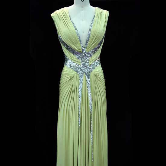 Shown here is a gorgeous evening dress featuring a sexy deep V-cut neckline. The dress is delicately pleated to exude an exceptionally graceful feeling. Shiny sequins are added to give out extra glamor.