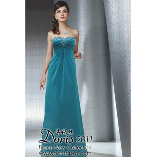 Featured is an evening dress designed in an enticing tiffany blue color. The sweetheart neckline is decorated with sparkling accents for added style. The higher waistline brings out a more flattering figure.