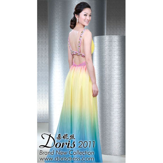 The soft rainbow hues suggest a delightful vibe for this lovely evening dress. The open-back design is charming and stunning in the spotlight. This sexy yet elegant evening dress makes a great fashion choice for celebratory events.