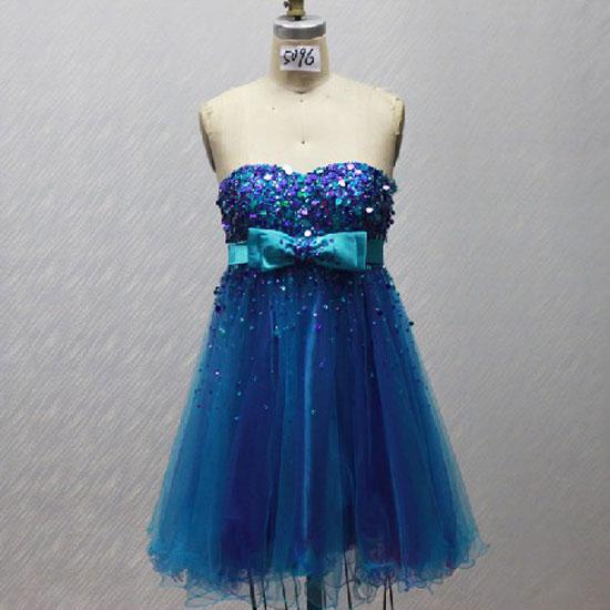 This pictured evening dress highlights a noble cobalt blue color. The sparkling details on the bodice and the velvety bow on the waist add style to the dress. This tube dress with a loose bottom is a nice party wear for the fun-loving ladies.