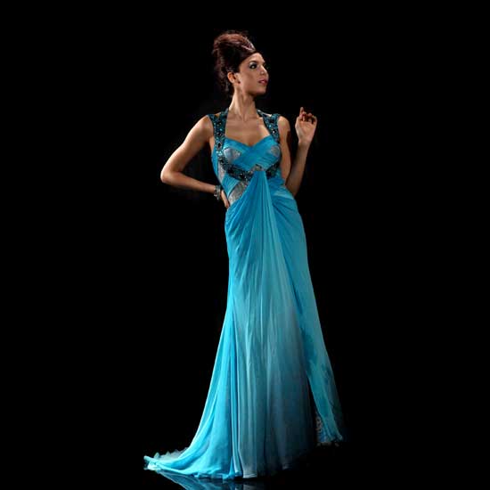 This evening dress is characterized by its gradient light blue tone, stealing the spotlight effortlessly. It features a sweetheart neckline with crisscrossing straps with lace. The hand glittery beaded shoulder straps lend extra glitz.