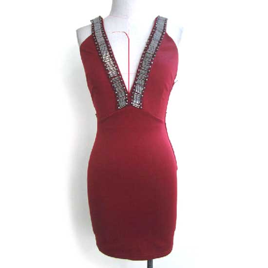 This evening dress in bold red features a deep V neckline with shiny embellishments along the straps and placket. It is well-tailored to exhibit your seductive figure. This elegant sleeveless evening dress is ideal for grand occasions.