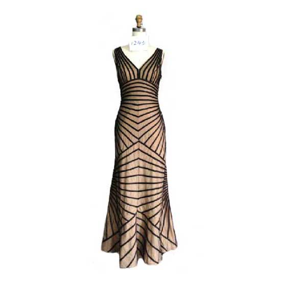 Displayed is an evening dress that comes in full length. Featuring a V-neckline, this sleeveless dress has carefully designed stripes that will showcase the curves of the wearer for an elegant look. This evening dress is made of high quality materials for your comfort.