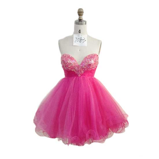 Displayed is an evening dress that comes in a lovely pink color. The sweetheart neckline is joined by a sparkling bodice and followed by a short and bouncy tiered skirt that showcases a lively spirit. This fashionable evening dress is a good choice for homecoming parties.