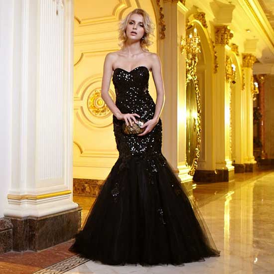 This is a ladies’ mermaid evening dress with dazzling sequins for an eye-catching look. It comes with a sweat-hearted neckline design for an elegant touch. Featuring a slim-fit design, this ladies’ evening dress showcases your alluring silhouette nicely.