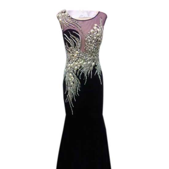 This is a gorgeous ladies' evening dress that comes in a black color. With velvet details, this evening dress is generously embellished with shiny beads to showcase the silhouette. The materials used are of high quality to guarantee your comfort.