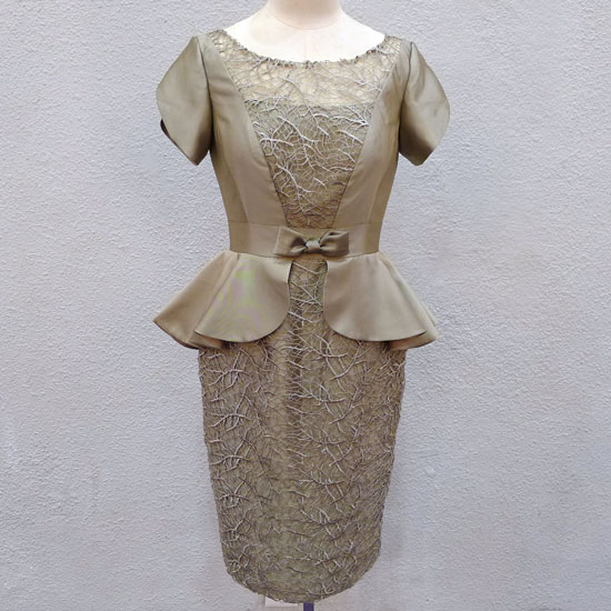 This is a ladies' evening dress that comes in allover gray for modern elegance. It is accented with allover lace details for a glamorous touch. This evening dress is finished with a classic round neckline, short sleeves and a bowtie waist.
