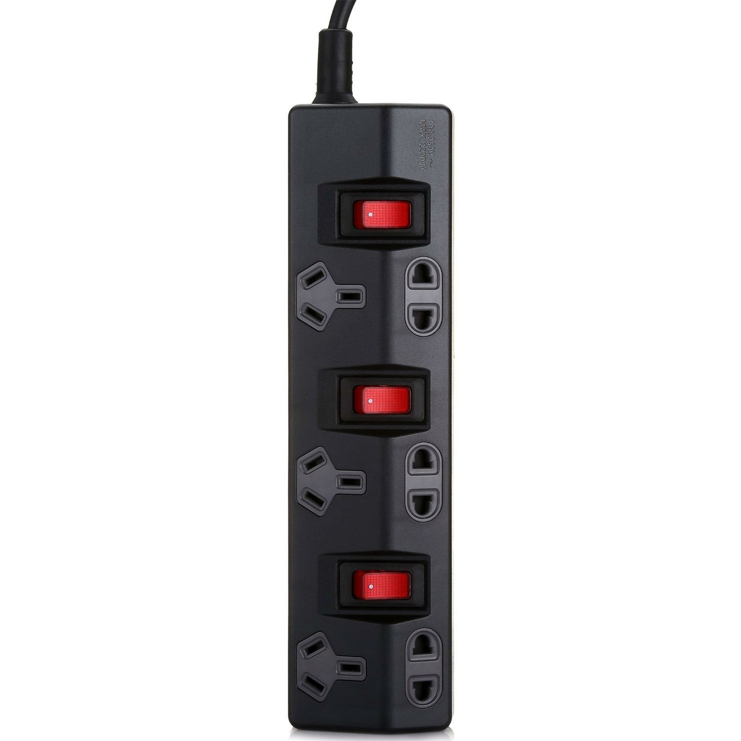 Displayed here is an extension socket with 6 electrical outlets. It comes in a rectangular shape and has three buttons for control. It allows you to use multiple electrical appliances at the same time and is suitable for home and travel use.