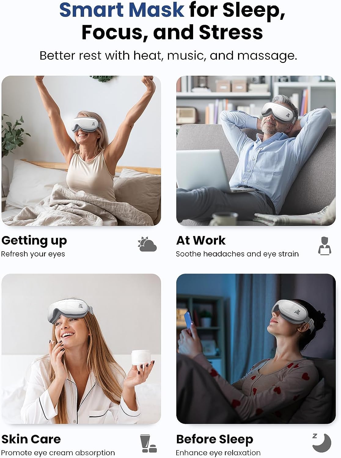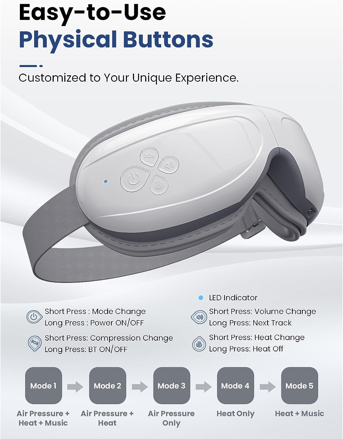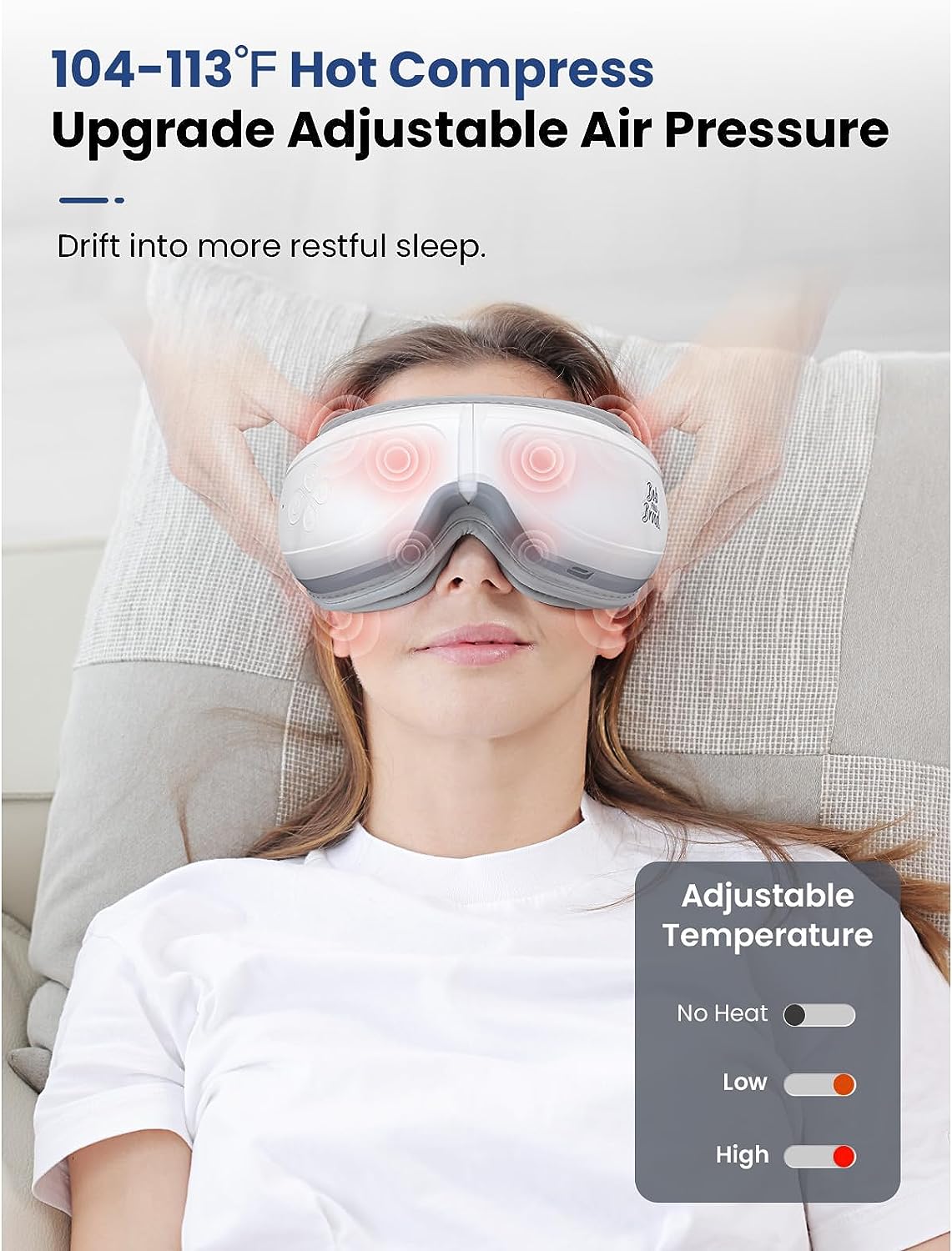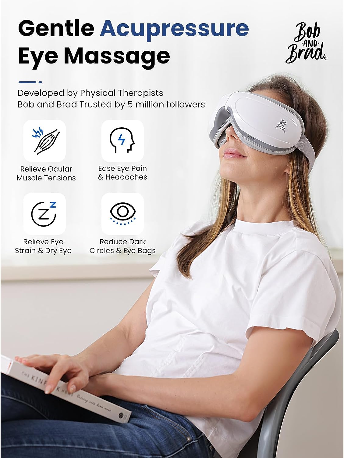 Bring Relief to Strained & Dry Eyes - Developed by famous US physical therapists Bob and Brad, the EyeOasis 2 eye massager with heat and compression stimulates the pressure points around the eyes to improve blood circulation. Built-in heating pads provide 2 heat levels with a comfortable temperature between 104℉-113℉, ideal for eye strain relief and dry eye. Notice: We do not recommend use of eye machines for customers who have undergone eye operation, retina condition, cataract, glaucoma, etc