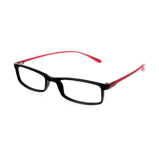 This eyeglass frame comes with full rims in a narrow rectangular shape. The slim temples are designed in a sharp red color to contrast the solid black rims. This fashionable eyeglass frame is made of high quality material for durability.