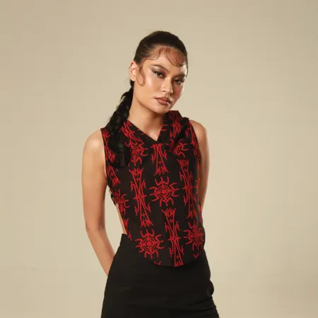 This top is made from traditional batik fabric adorned with the symbolic Kakehan, a traditional motif from North Maluku, Indonesia. The design includes a hood, giving it a bold, masculine, yet sexy appeal. The back is equipped with adjustable ties, allowing the wearer to modify the length and fit according to their body shape. This piece is perfect for specific occasions or performances that call for a strong and character-driven look.