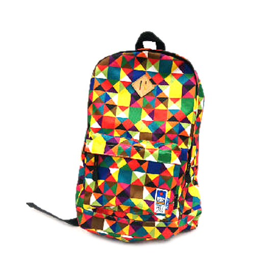 This is a fabric backpack that is accented with allover colorful checkered patterns. It is fitted with a main large compartment and several pockets. This fabric backpack offers an extra-long service life.