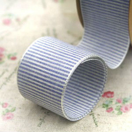 This is a fabric ribbon with white and blue stripe patterns. It is made of 100% cotton material for robustness. This ribbon is a great choice for decorating garments, making fashionable accessories, and so on.