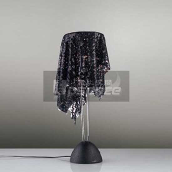 This is a table lamp with an elegant and modern appearance. It features a metal main structure with a unique fabric lampshade. The black sturdy base allows the lamp stand on any flat tabletop steadily.