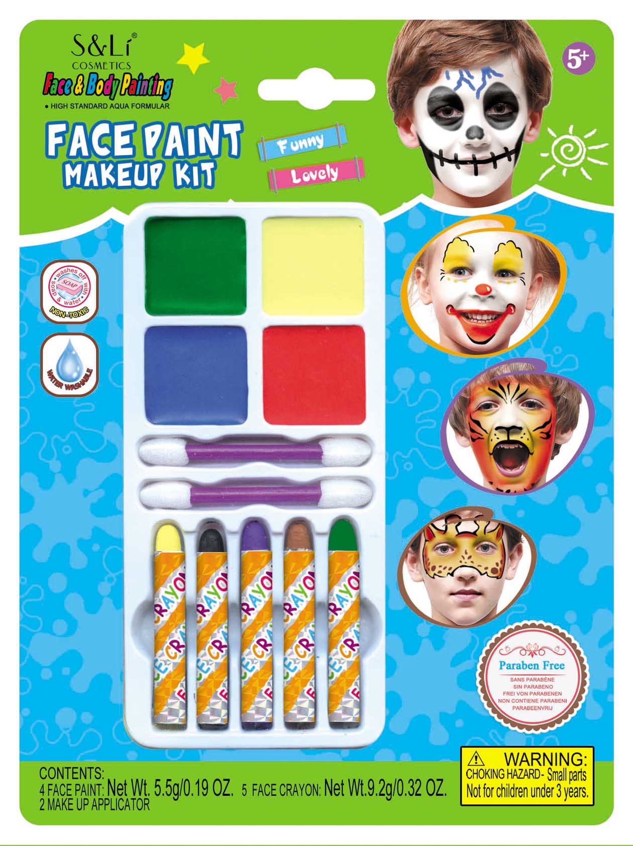 This face paint and face crayon set includes face paints in 4 colors, face crayons in 5 colors and 2 makeup applicators. It is excellent for kids’ events and can be used to paint skulls, clowns and animals on the faces of kids. The face paint and crayons are water washable and won’t leave a mess afterwards.