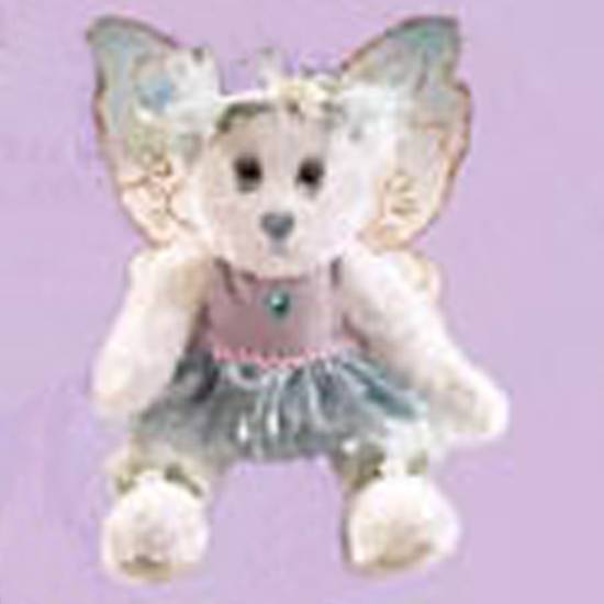 This teddy bear is bean stuffed and dressed in an adorable fairy outfit. The pink and baby blue colored fairy dress has green stone on the chest. The wings are attached on the back of the dress. It also a head accessories which is detailed with a flower.