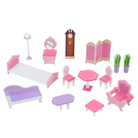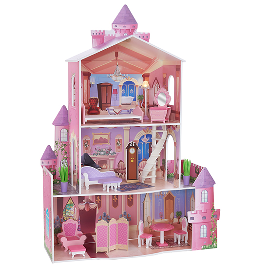 princess style doll house, includes 14 pc furniture, lamp with light. spiral stair and throne for King.