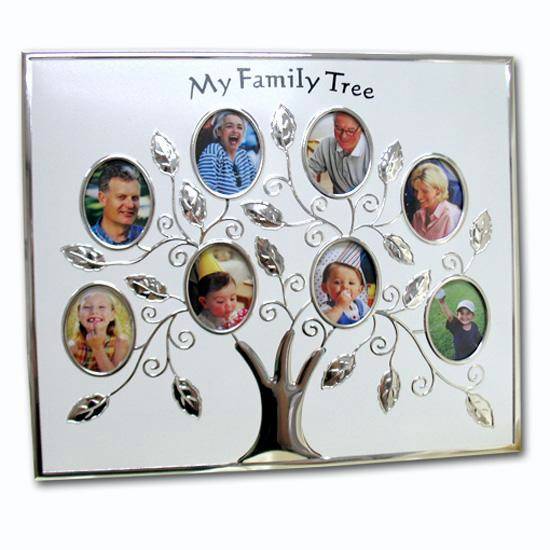 The family tree photo frame can display up to 8 photos at a time. The frame is interspersed with embossed foliage patterns in sleek, silvertone finish for added style. This pretty photo frame makes a great item to show off treasured photos of family members.