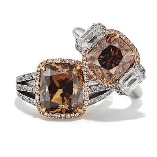 Displayed is a fancy color diamond ring collection that uses a combination of white and rose gold. Featuring a large orangish brown centerpiece, these rings are charming and elegant. These gorgeous rings are accented with sparkling diamonds for a touch of fashion.