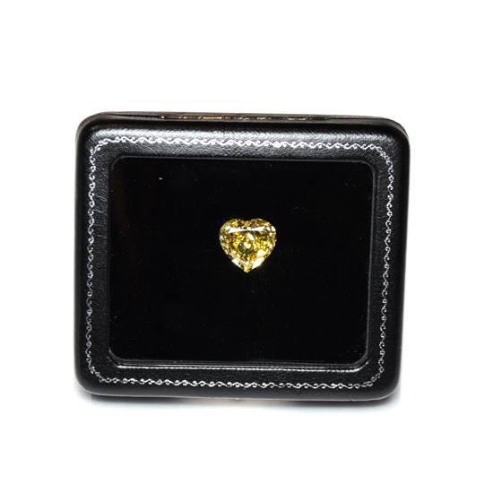 The featured item is a faceted loose fancy diamond in a heart shape, which is for setting and mounting on jewellery. Its vivid yellow presents a glamorous and sparkling appearance. The piece is perfect as a main stone of any fine jewellery.