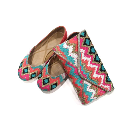 This fashion accessory comes with an evening envelope clutch and a pair of ballet flats. The pieces feature a zigzag pattern for a fashionable look. They are embellished with nice hand embroidery.