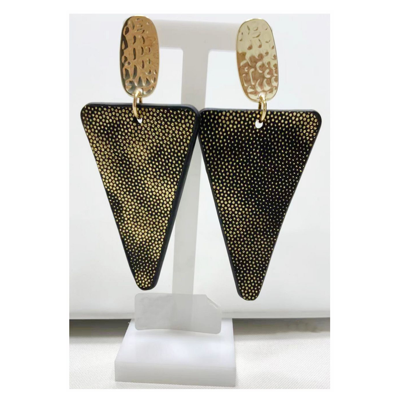 As shown is a high-fashion golden plated plastic parts and charm drop earring.