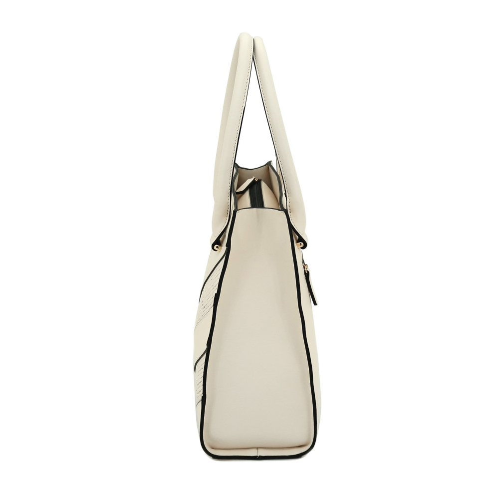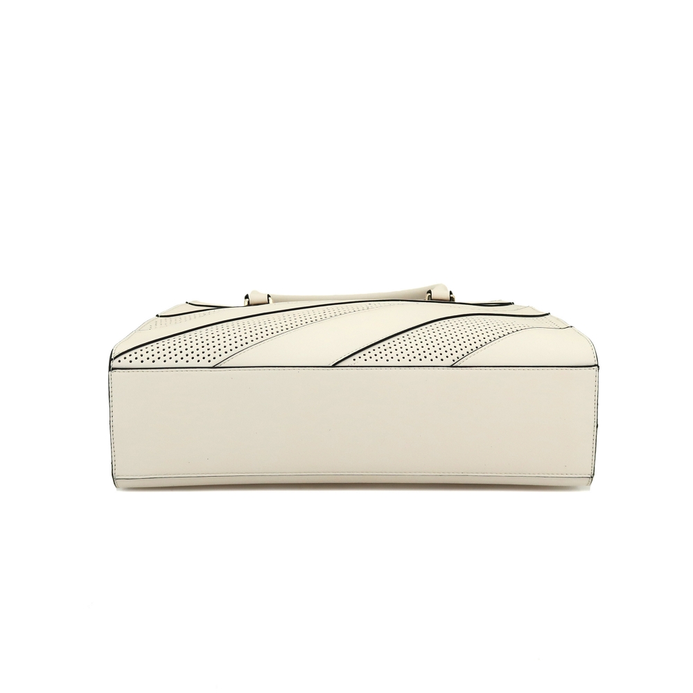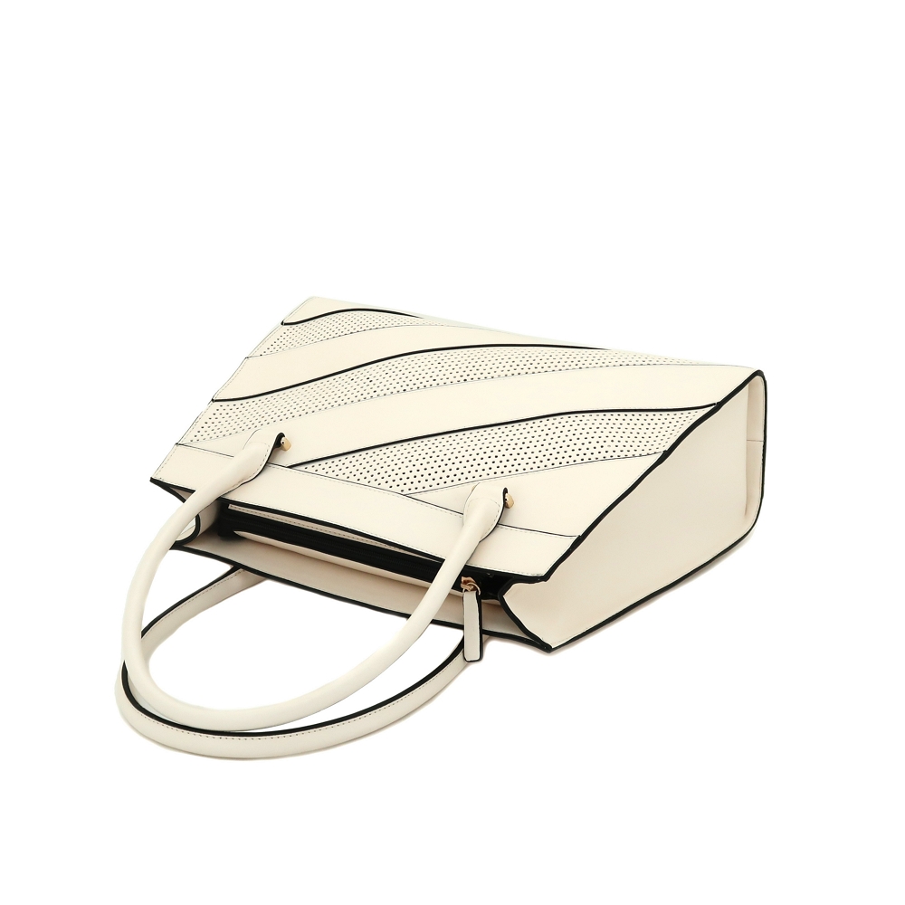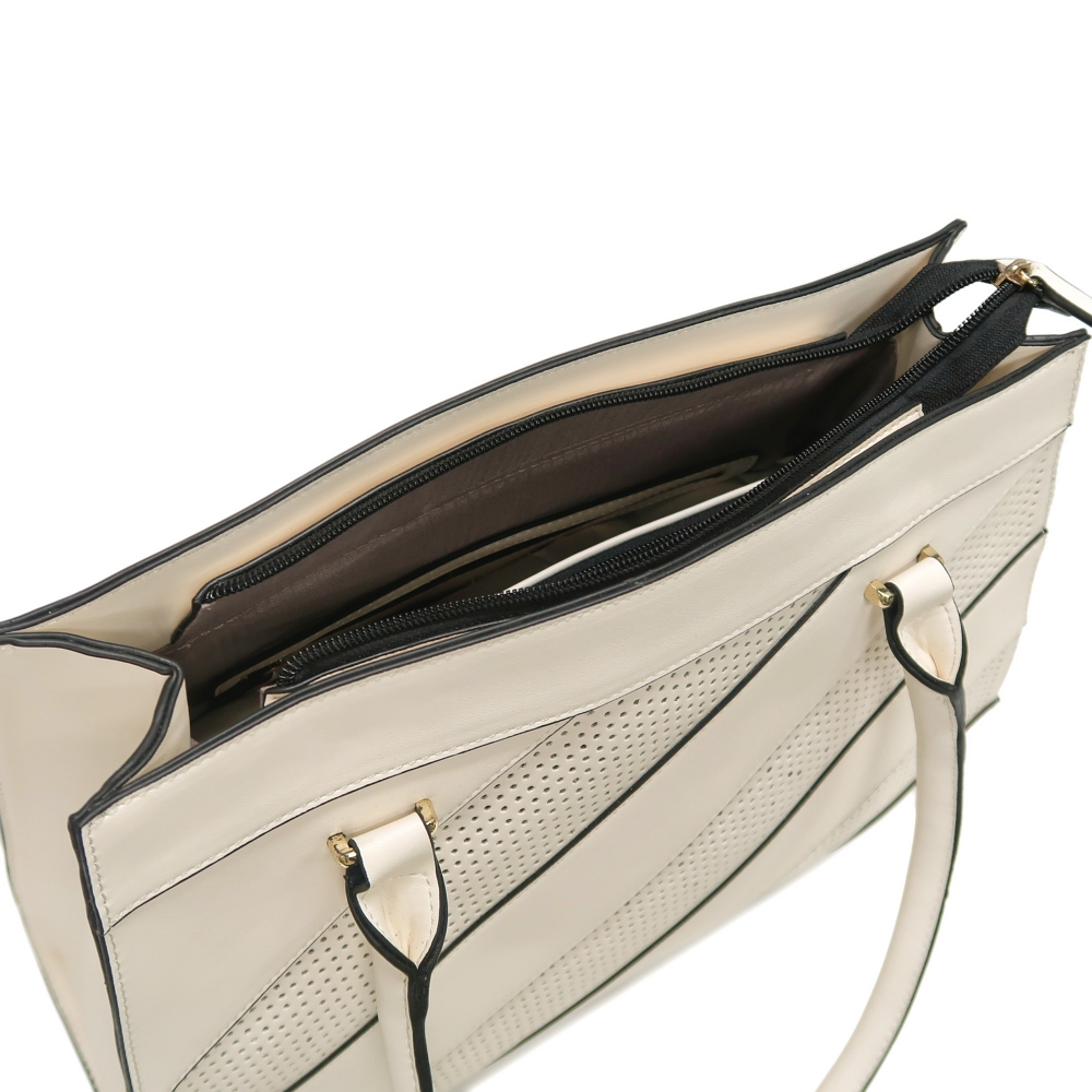 - Top zipper closure with punch hole pattern front panel
