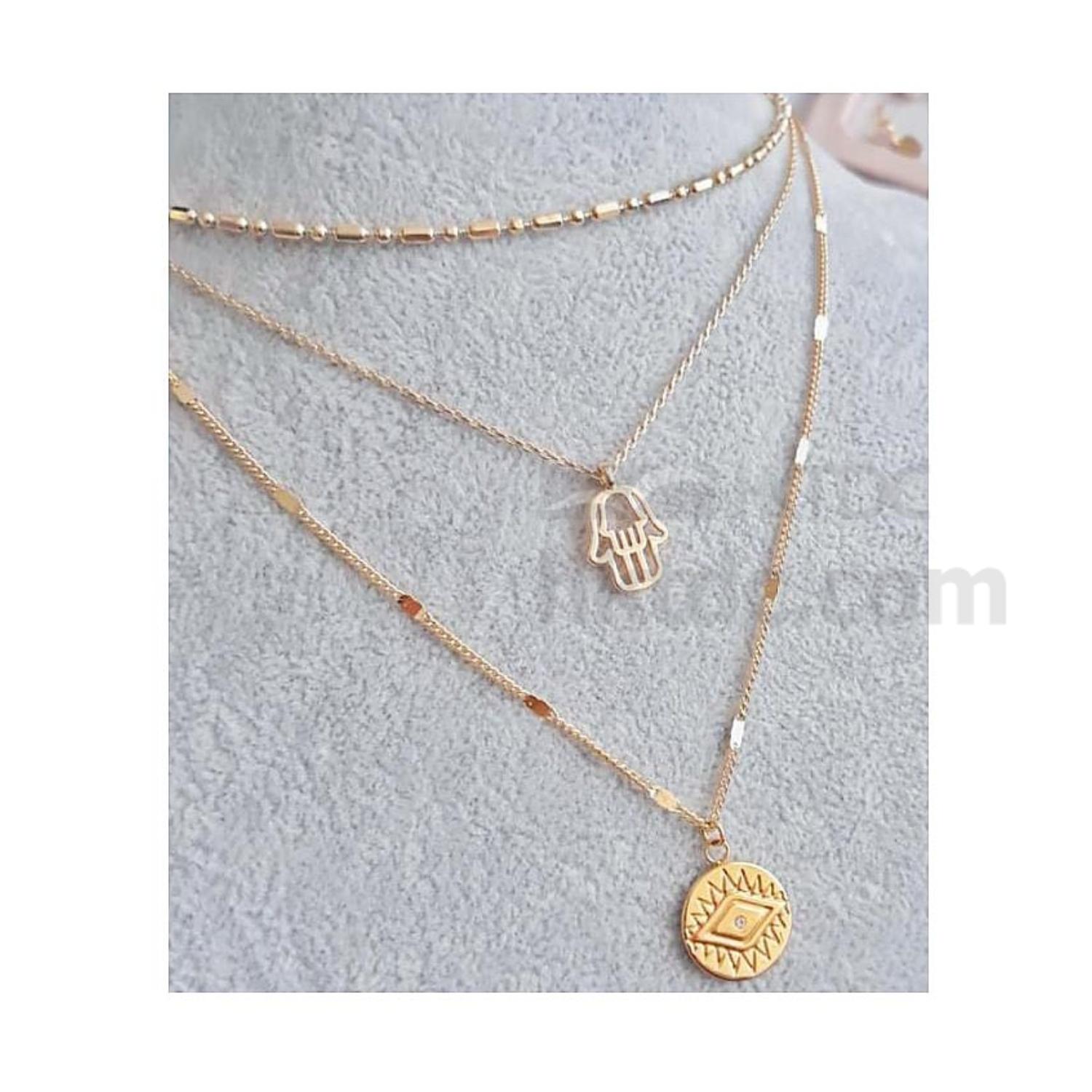 As shown is an elegant trendy necklace with multiple strands each highlighted by metallic accessories.