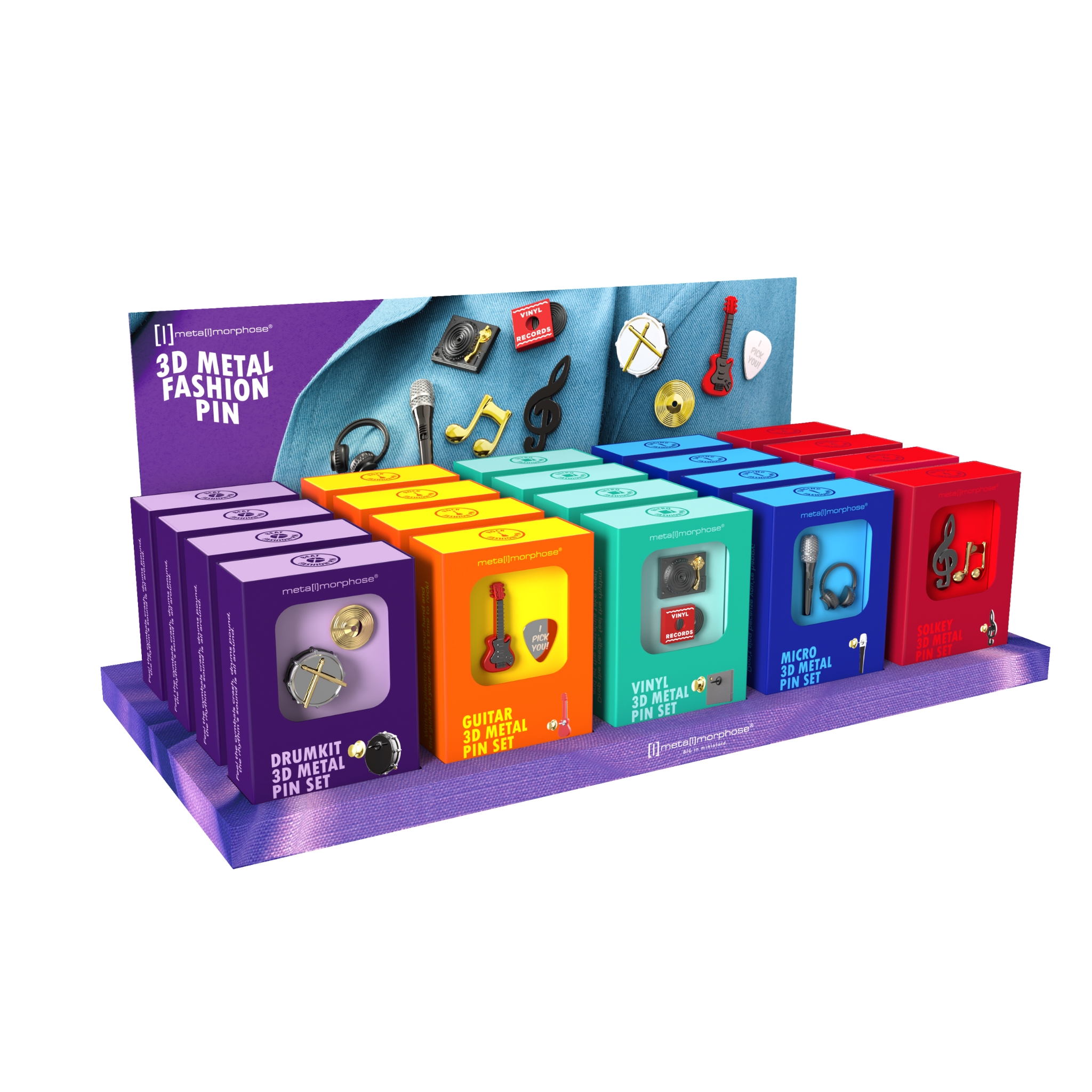 Theme pin display (music) - See selection and BC info below - The display carton contains 1 display + header + 6pcs per sku. Total 5 styles x 6pcs.