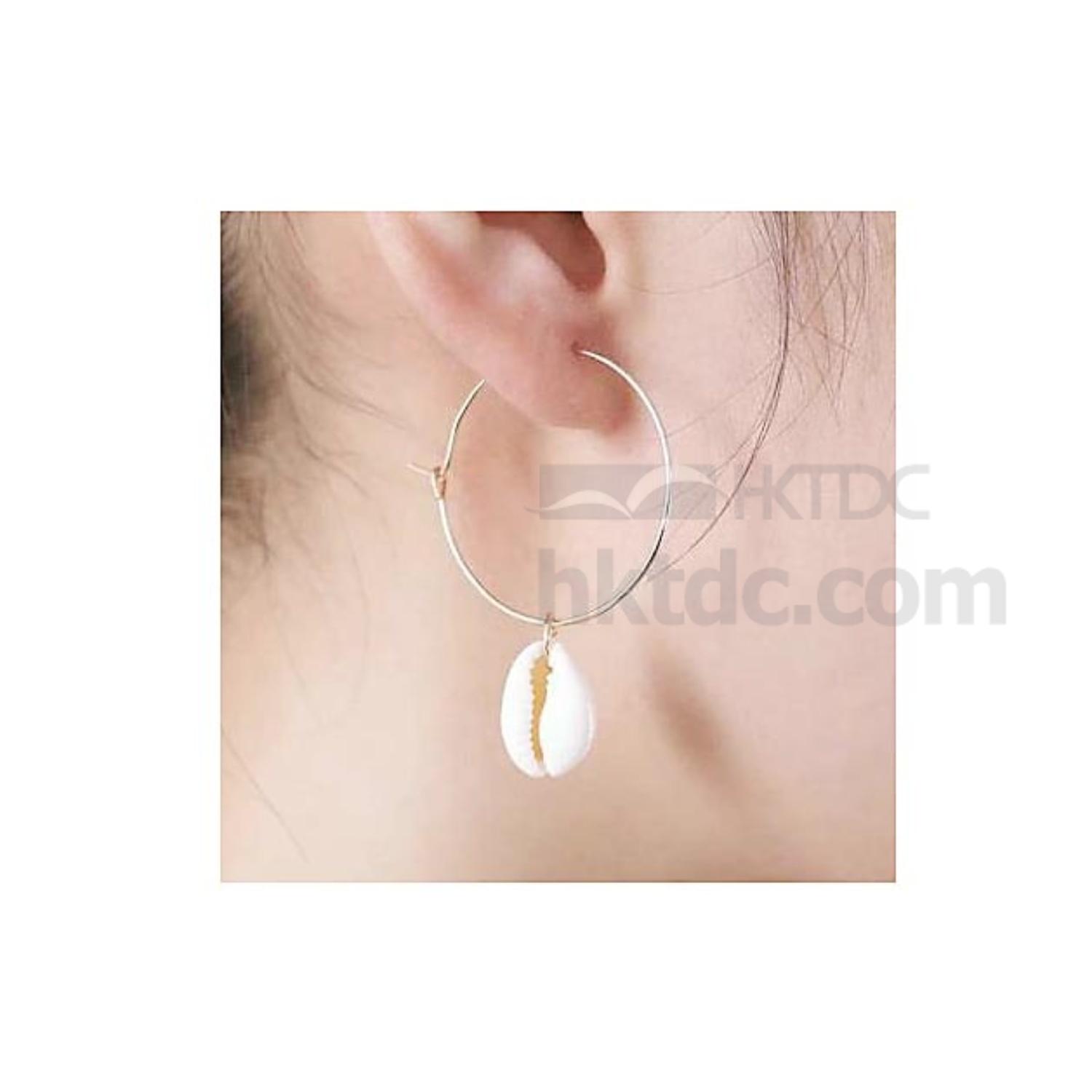 As shown is a high-fashion golden plated natural shell charm hoop earring.