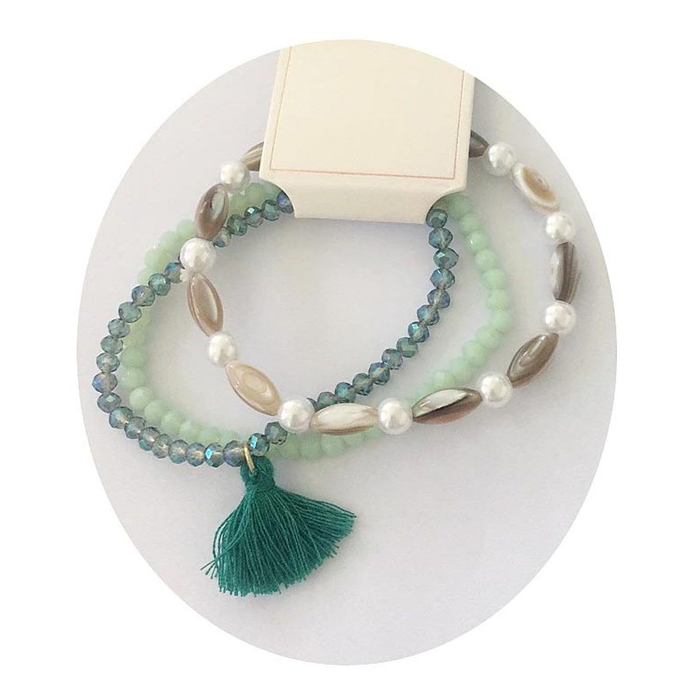 This is an elegant 3 pieces elastic bracelet set made from a variety of beads and materials including glass beads, faux shell beads and plastic beads.