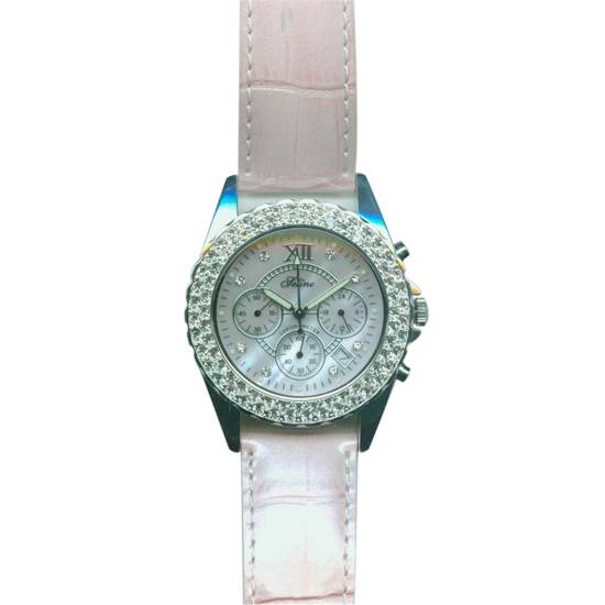 This is a fashion analogue watch for ladies. The watch features chronograph function. There are crystals decorated around the watch case.