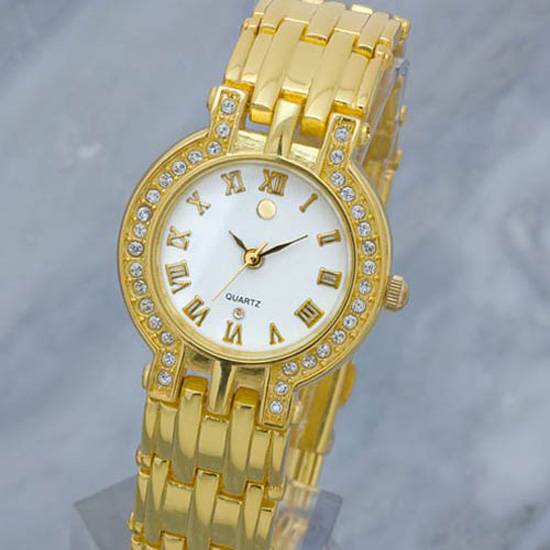 This is a fashion watch for ladies' use. The watch is plated with golden metal watch band and watch casing. The watch is decorated with sparkling stones