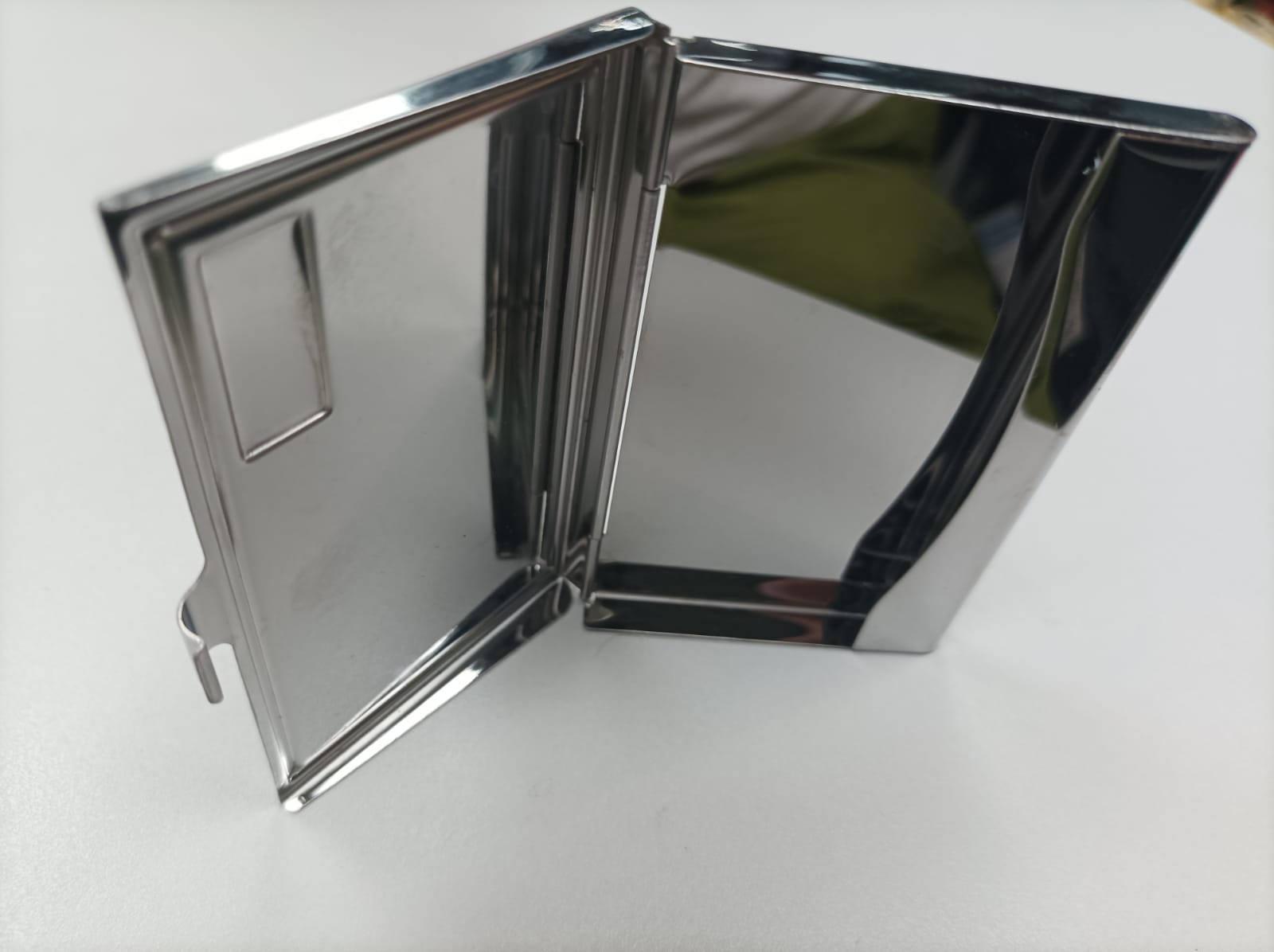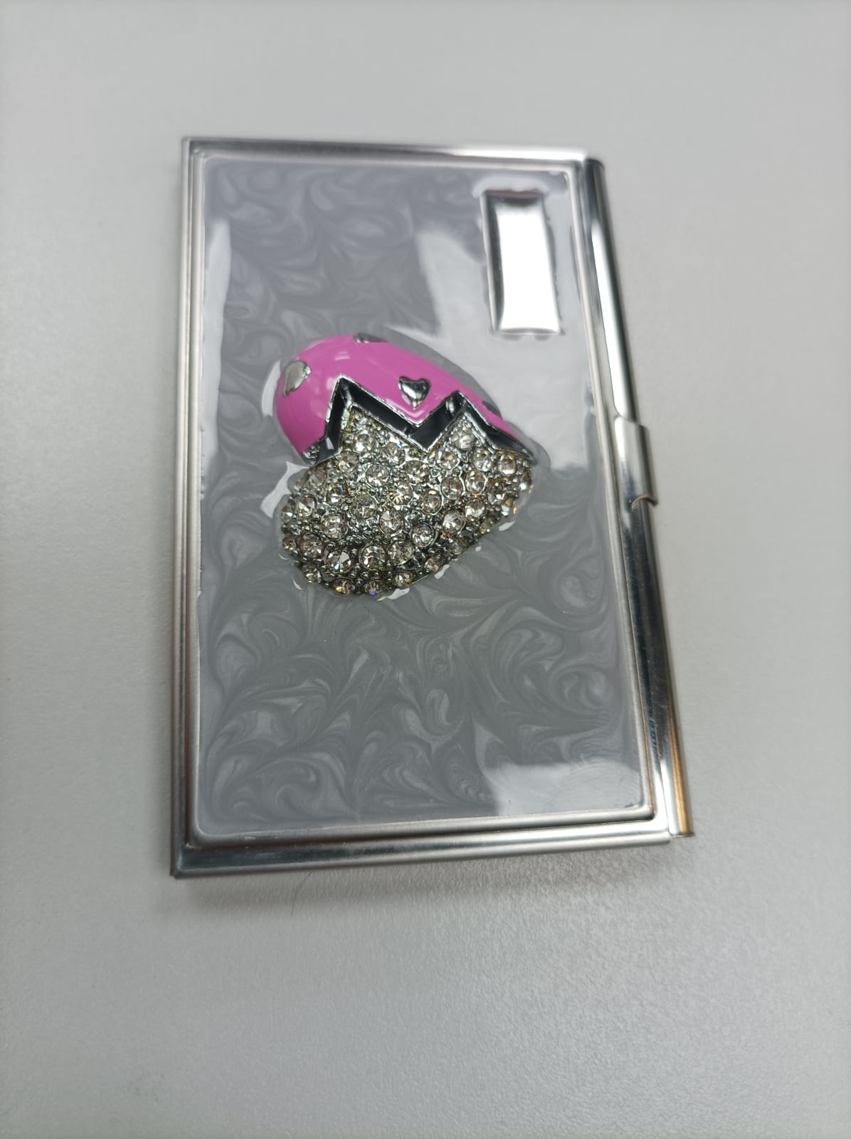 A fashionable card holder that protects all your cards and keeps them safe. Metal with 3d hearth shaped logo on top of it.