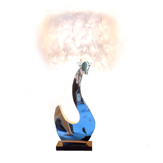 This feather table lamp comes with a feathery lamp shade in white. The metallic lamp base flaunts a curvy shape that attracts eyeballs. This fun, surprising lamp lends a fancy touch to your home.