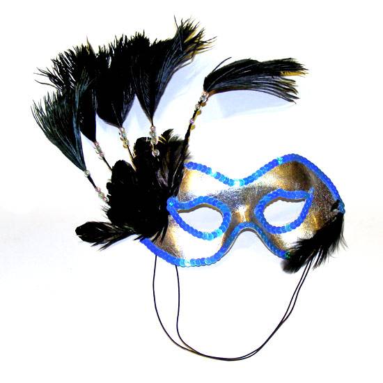 This is a hand-made feather mask which has delicate details and unique style. There are blue shiny pieces stitched round the mask and black feathers with beads attached to the mask.