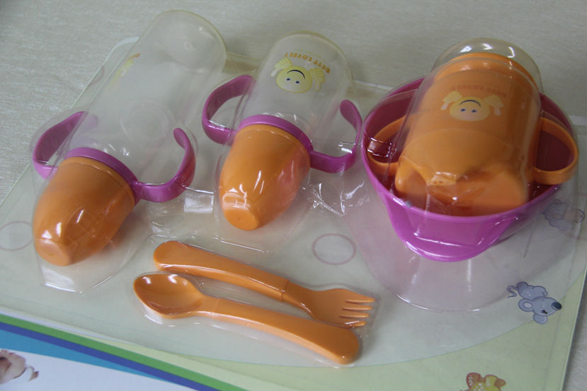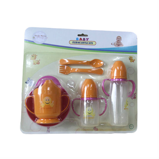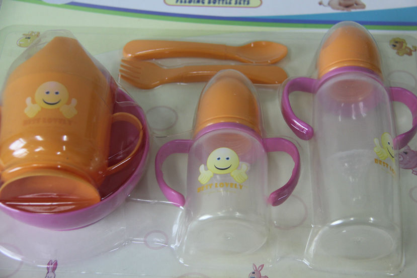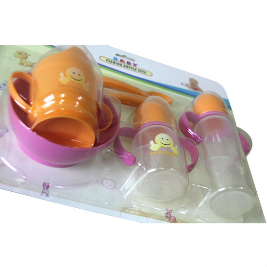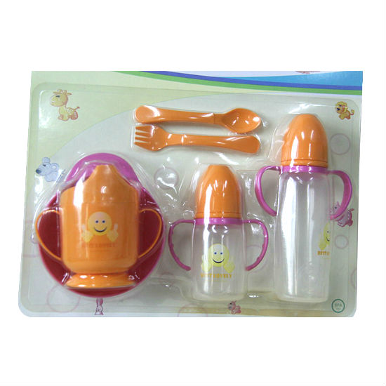 This is a 6-in-1 feeding set which includes 2 milk bottle, a drinking cup, a feeding bowl, a fork and a spoon.